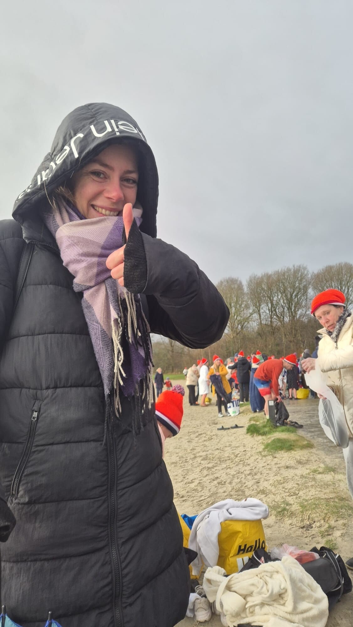 Uiteindelijk werd het 12.00 uur: de warming up dames namen een megafoon en begonnen af te tellen: en als je dan bij "nul" bent, moet je er echt aan geloven: looppas naar het water en erin.