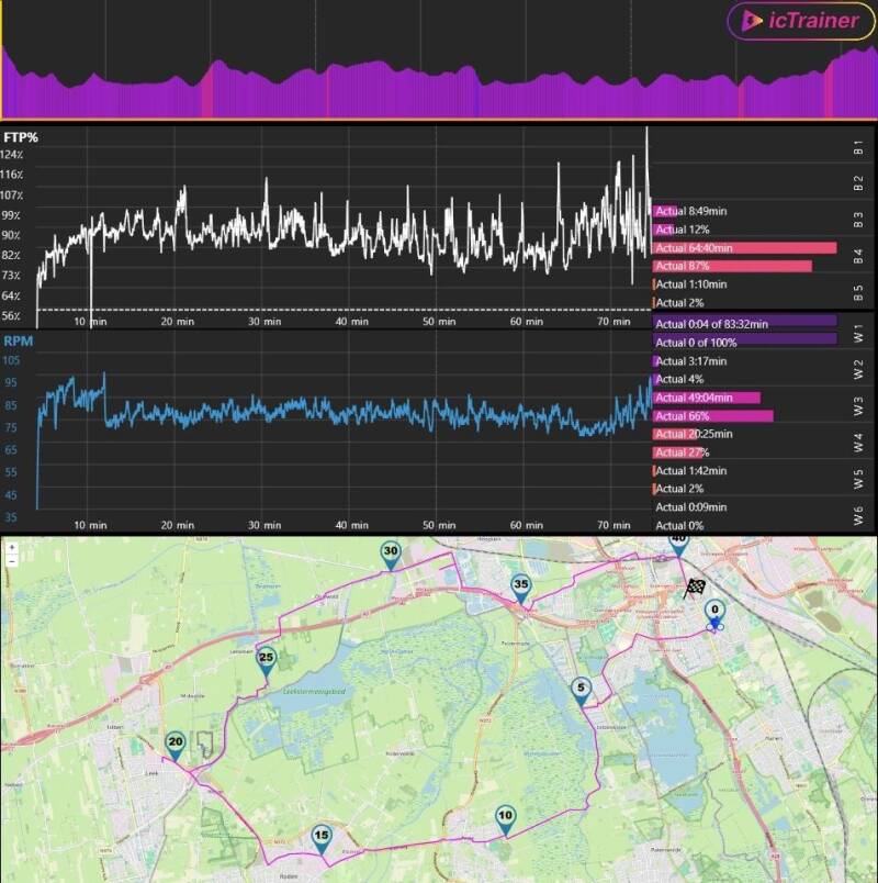 De Buffel had ergens een nieuw indoor fietsprogramma opgeduikeld waar je ook zelfgemaakte routes in kon zetten: die routes kon je dan via de GPX files in het programma laden, er verscheen dan een kaartje van de route met een fietsertje erop en als je begint met trappen, rijdt dat fietsertje de route.