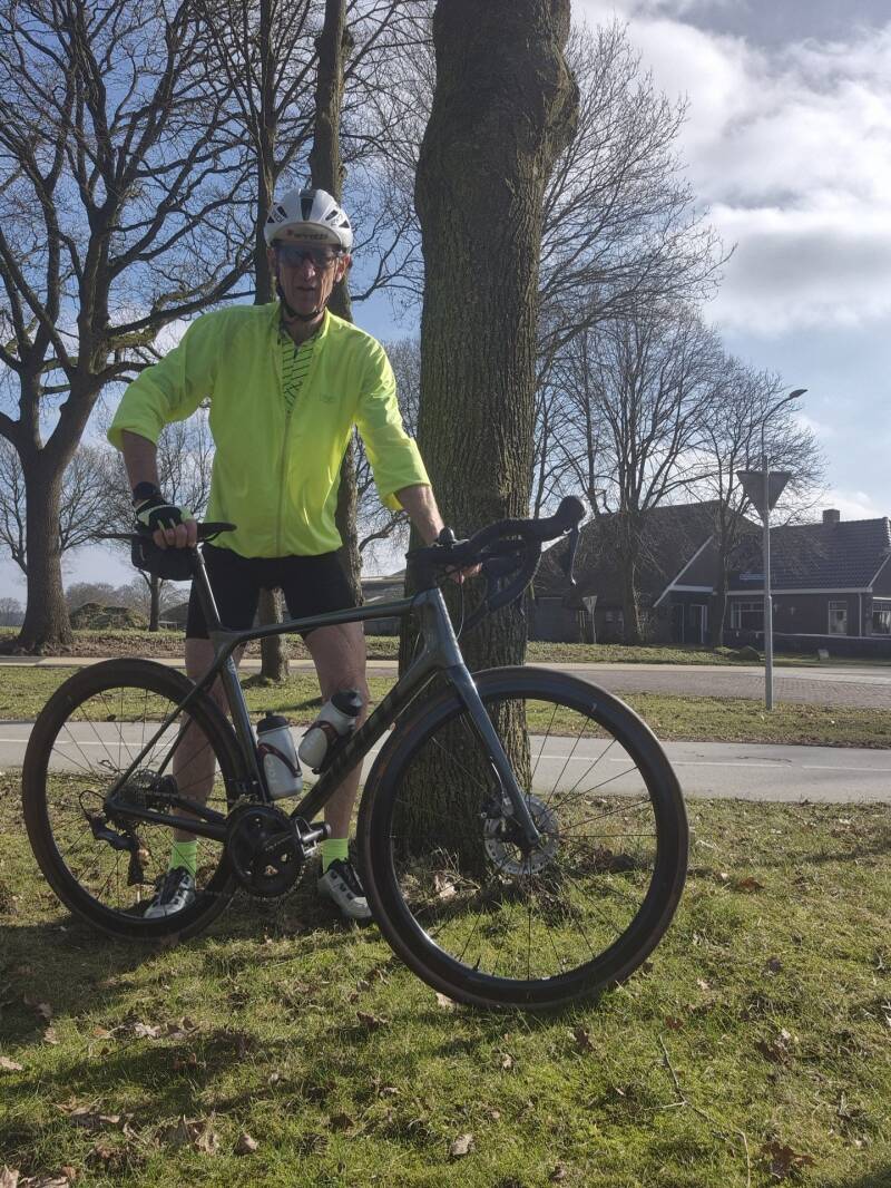 Maar omdat het bloed toch kruipt waar het niet gaan kan, stapte hij vandaag even op voor een rustig ritje, zonder klimmen, samen met Piet Johan en Henk.
